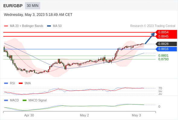 欧元/英镑 当日内: 看涨,当 0.8816 为支撑位,目标定在0.8854。
