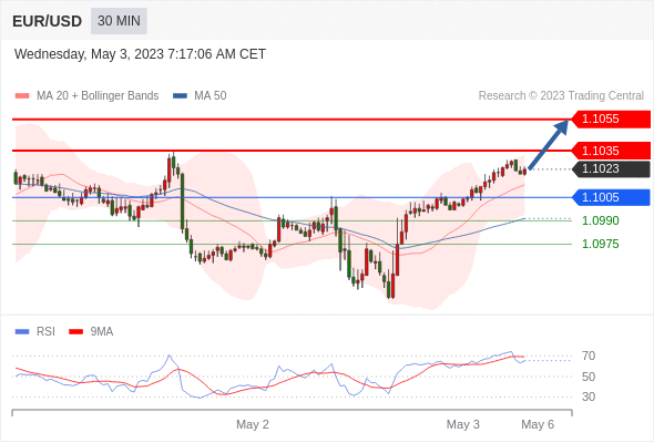 在 1.1005 之上,看涨,目标价位为 1.1035 ,然后为 1.1055 。