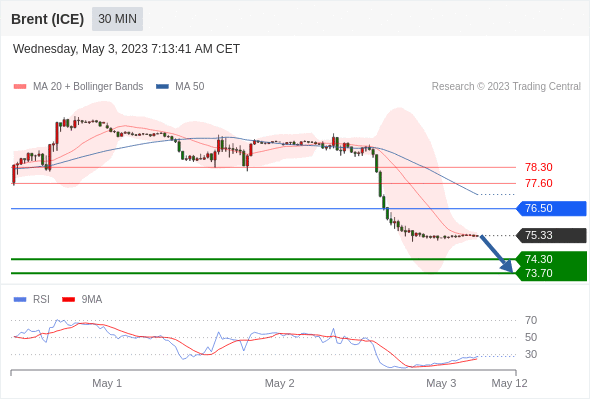 在 76.50 之下,看跌,目标价位为 74.30 ,然后为 73.70 。
