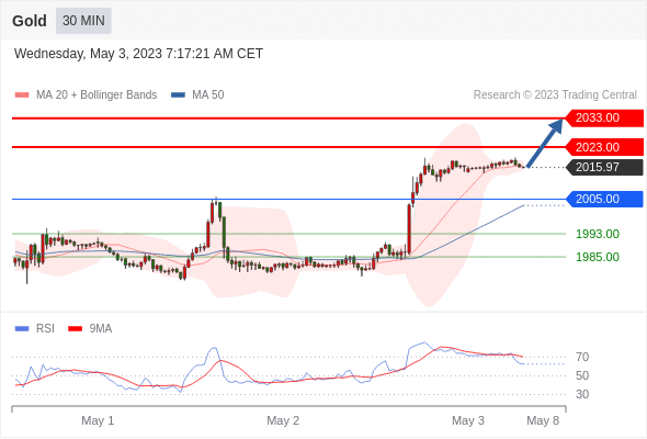 在 2005.00 之上,看涨,目标价位为 2023.00 ,然后为 2033.00 。