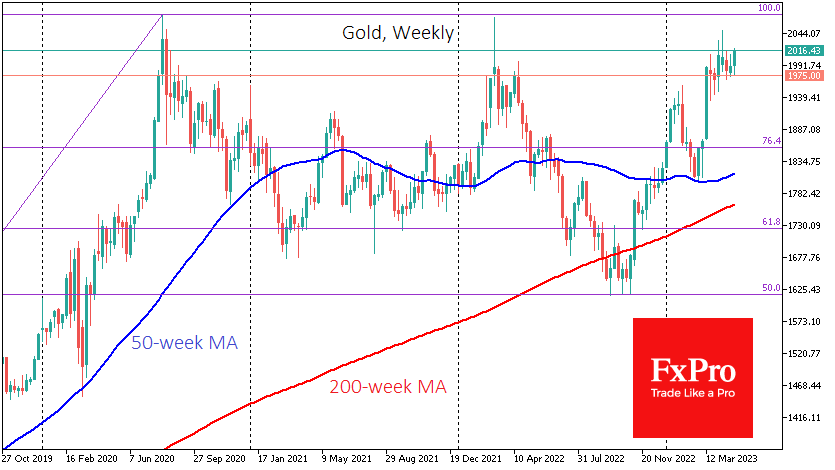 市场动态表明,最近回落至2000美元的水平是进一步上升的序幕,而不是像以前那样结束了一段漫长的反弹。这表明我们将很快看到价格超过2050美元(之前的高点区域),并且在未来几周内,随着历史高点的更新,突破2075美元的可能性增加。