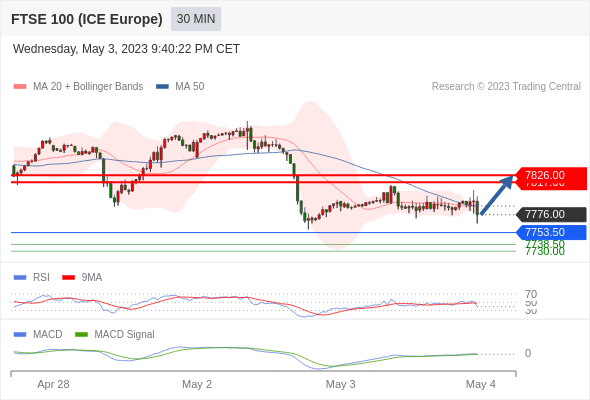 如跌破 7753.50 ,英国富时100指数期货 目标方向定在 7738.50 和 7730 。