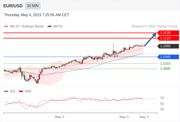 在 1.1040 之上,看涨,目标价位为 1.1110 ,然后为 1.1130 。