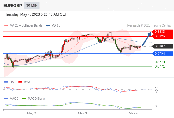 欧元/英镑 当日内: 有上涨的可能,目标价位定在 0.8833 。