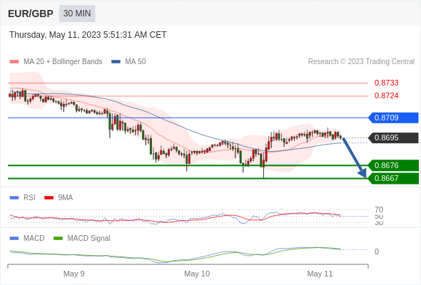 欧元/英镑 当日内: 逐渐下跌,当 0.8709 阻碍上行,则 0.8667 为目标位。