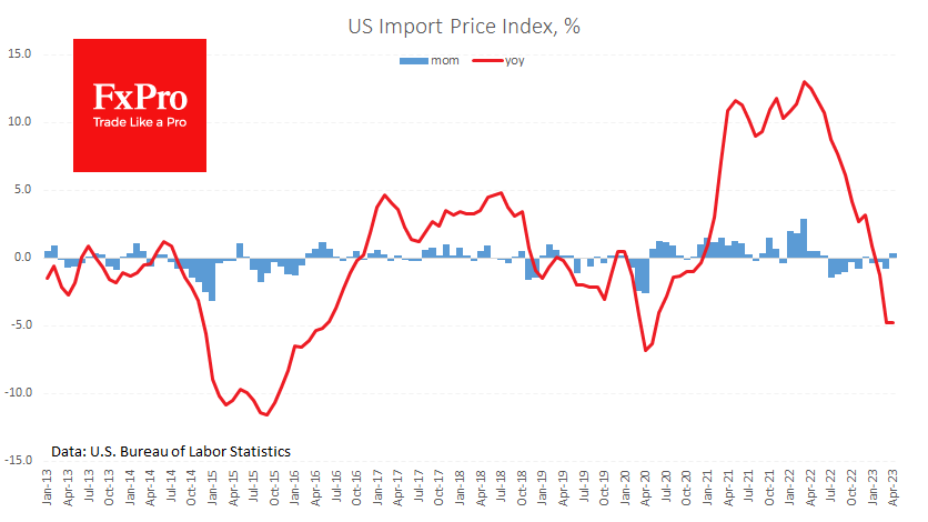 FxPro高级分析师Alex Kuptsikevich指出:美国是一个巨大的进口国,因此该指数的发展将显著影响未来几个月的CPI通胀。该指数的年增长率从去年4月开始大幅下降。PPI(生产价格指数)开始下降,CPI(消费者物价指数)达到峰值还需要三个月时间。
