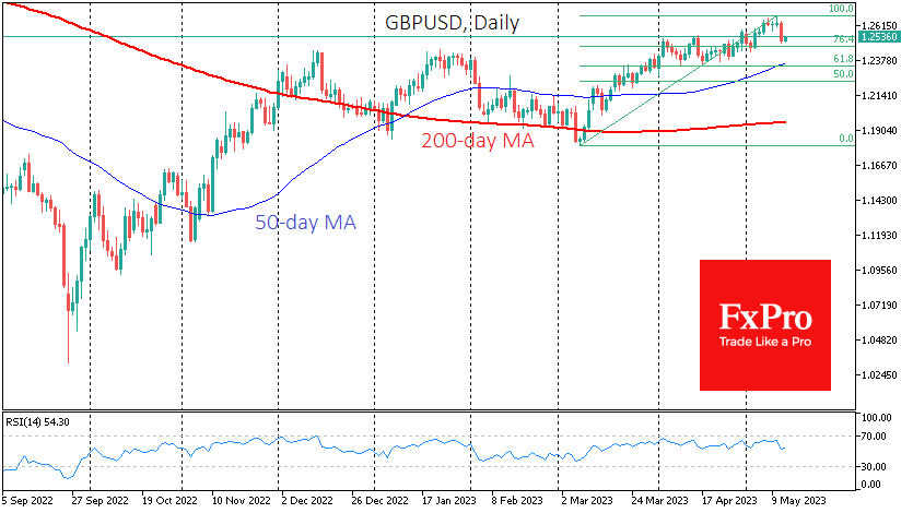 英镑的反应很有趣。当日收盘前,英镑兑美元三位数的下跌抹去了最初0.3%的涨幅,使英镑兑美元拉回至1.25。自3月初英镑反弹以来,市场参与者继续获利,回想起“5月卖出并离场”的谚语(指在5月沽出股票,到11月再买入)。英镑兑美元可能在1.2350附近出现回调,这是3 - 5月反弹的61.8%回调位,也是4月以来的局部支撑位和50日移动均线。