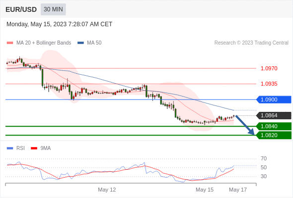 欧元/美元 当日内: 短期关键阻力位在1.0900。