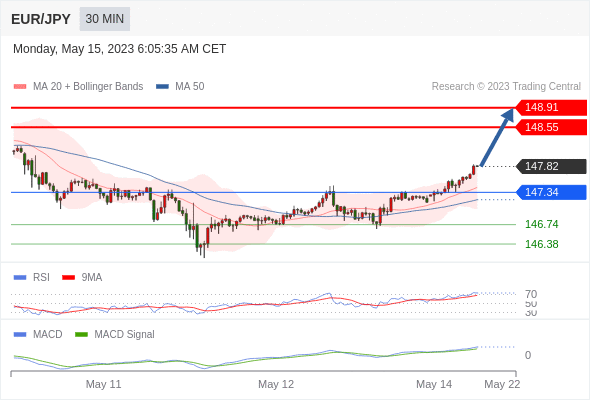 欧元/日元 当日内: 看涨,当 147.34 为支撑位。