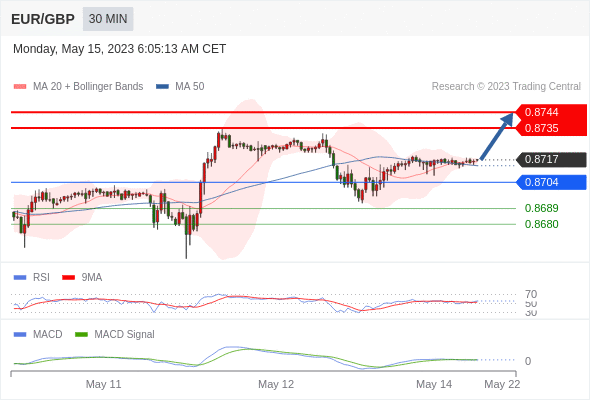欧元/英镑 当日内: 看涨,当 0.8704 为支撑位,目标定在0.8744。