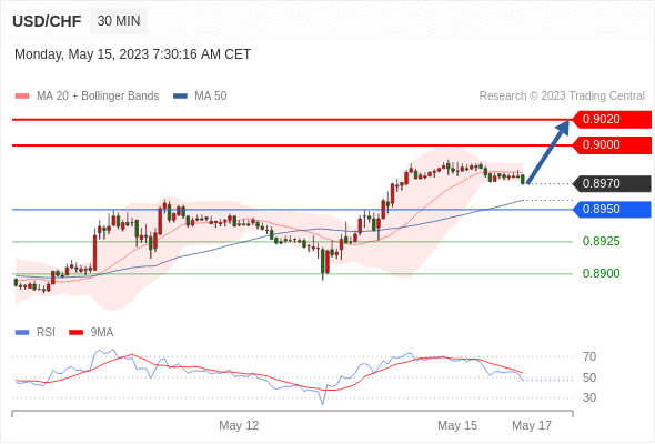 美元/瑞郎 当日内: 在0.8950之上,看涨。