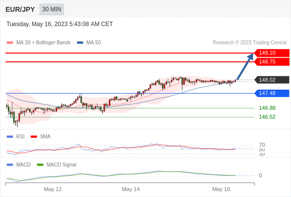 欧元/日元 当日内: 看涨,当 147.48 为支撑位。