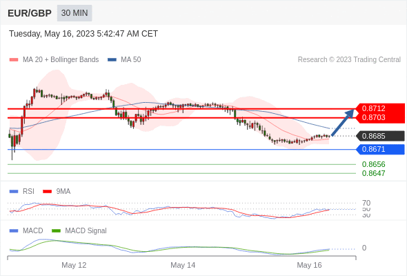 欧元/英镑 当日内: 有上涨的可能,目标价位定在 0.8712 。