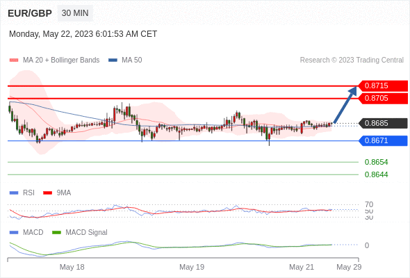 欧元/英镑 当日内: 看涨,当 0.8671 为支撑位。