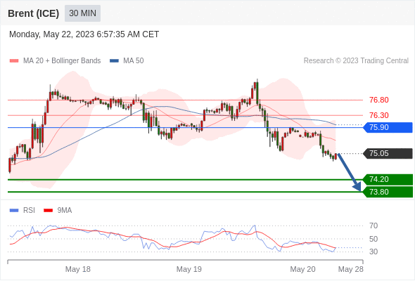 在 75.90 之下,看跌,目标价位为 74.20 ,然后为 73.80 。