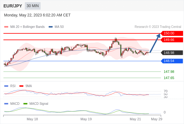 欧元/日元 当日内: 有上涨的可能,目标价位定在 150.00 。