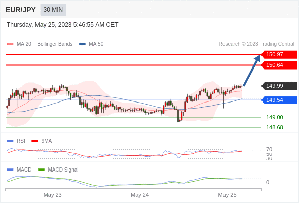 欧元/日元 当日内: 看涨,当 149.54 为支撑位。