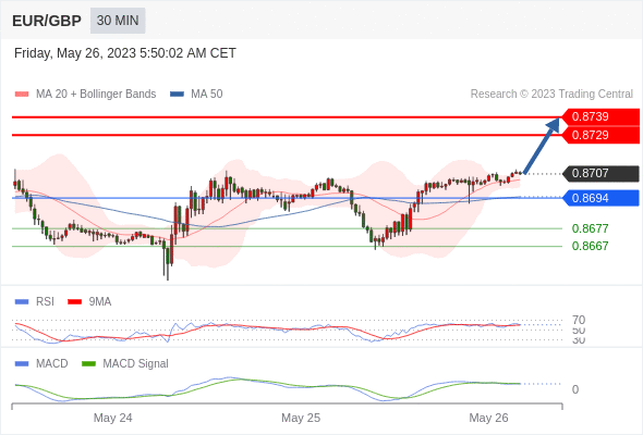 欧元/英镑 当日内: 看涨,当 0.8694 为支撑位,目标定在0.8739。