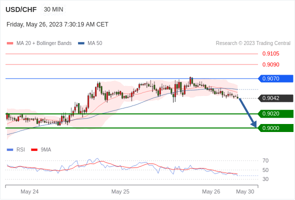 在 0.9070 之下,看跌,目标价位为 0.9020 ,然后为 0.9000 。