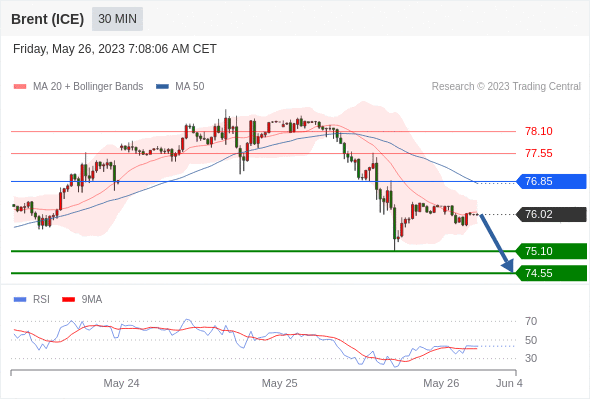 布伦特原油 (ICE)? (N3)? 当日内: 短期关键阻力位在76.85。