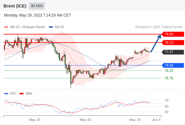 布伦特原油 (ICE)? (N3)? 当日内: 在76.60之上,看涨。
