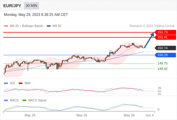 欧元/日元 当日内: 看涨,当 150.29 为支撑位,目标定在151.73。