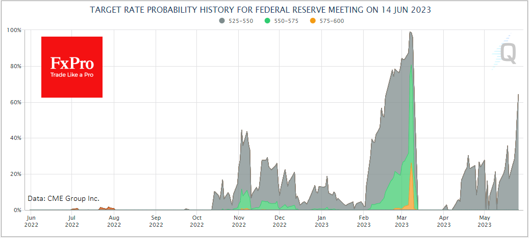 出现上述情况的主要原因是市场对美联储将在6月中旬再次加息的预期增加。截至本周二上午,出现这种结果的几率超过64%,而在5月初上一次反弹开始时几乎为零。加息预计将吸引资金流入美元,而在地区银行业危机期间,这些资金曾规避美元。