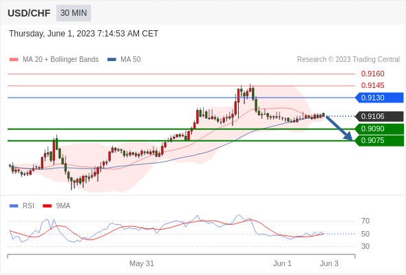 在 0.9130 之下,看跌,目标价位为 0.9090 ,然后为 0.9075 。