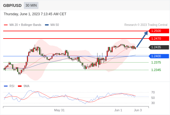在 1.2400 之上,看涨,目标价位为 1.2470 ,然后为 1.2500 。