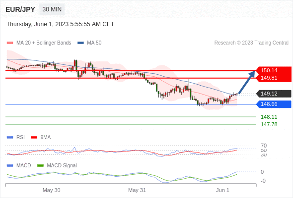 欧元/日元 当日内: 看涨,当 148.66 为支撑位。