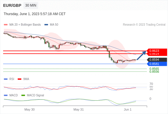 欧元/英镑 当日内: 有上涨的可能,目标价位定在 0.8623 。