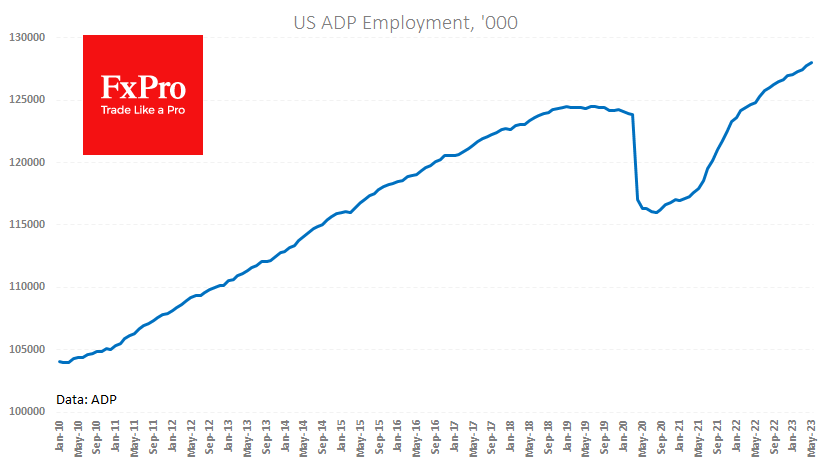 与非农就业数据(NFP)密切相似的第三个指标是私营部门就业与ADP的变化。报告称,就业人数从上月的29.1万增加了27.8万,比分析师的平均预期高出约10万。据分析师估计,自本周初以来,市场一直预期就业增长约为19万。