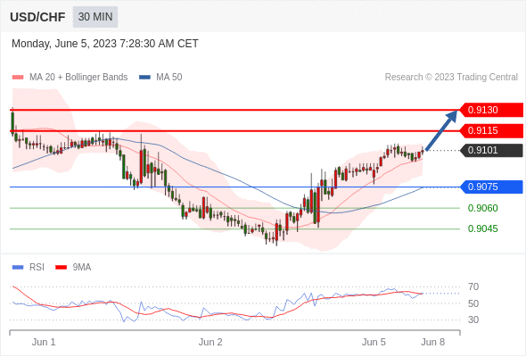 在 0.9075 之上,看涨,目标价位为 0.9115 ,然后为 0.9130 。