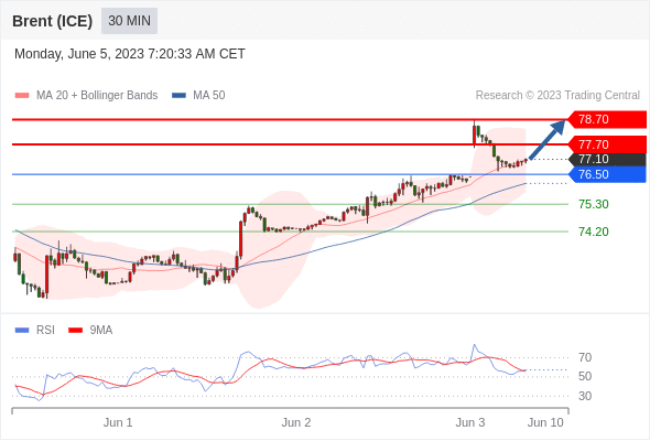 布伦特原油 (ICE)? (Q3)? 当日内: 在76.50之上,看涨。