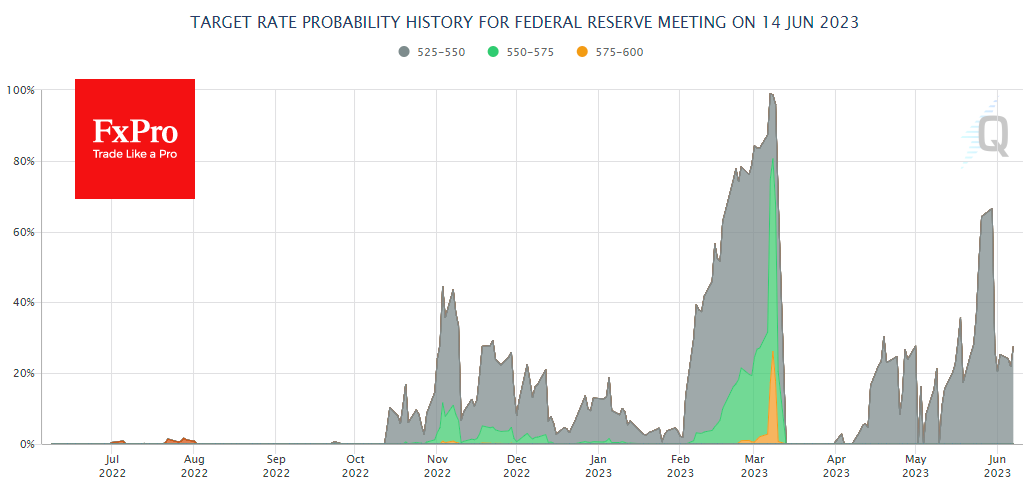 美联储政策预期的变化引发了高科技股指数的抛售。然而,这样的触发器看起来很不寻常。根据CME的FedWatch工具,市场目前预计下周三加息的可能性与前一天相同,为27.5%。例如,上周初的概率为66.5%,指数处于同一水平。