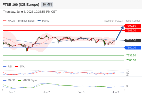 英国富时100指数期货 当日内: 看涨。