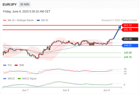 欧元/日元 当日内: 看涨,当 149.62 为支撑位。