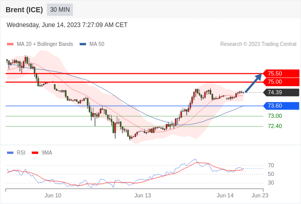 布伦特原油 (ICE)? (Q3)? 当日内: 在73.60之上,看涨。