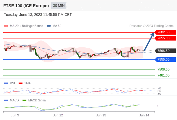 看涨,当 7555 为支撑位,目标定在7682.50。