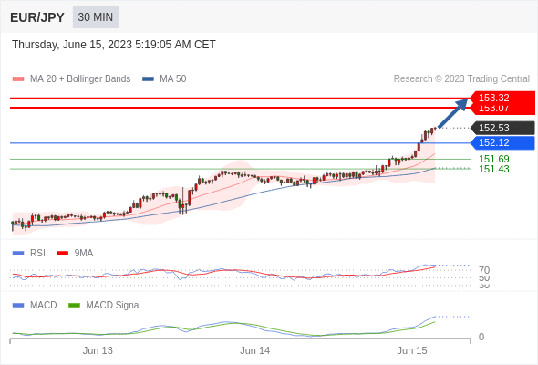 欧元/日元 当日内: 看涨,当 152.12 为支撑位。
