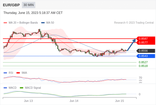 欧元/英镑 当日内: 看涨,当 0.8543 为支撑位。