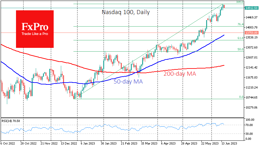 在联邦公开市场委员会(FOMV)的决定和评论之后,纳斯达克100指数下跌1.4%,周三上涨约1.7%,收于14个月高点,短暂突破15000点。