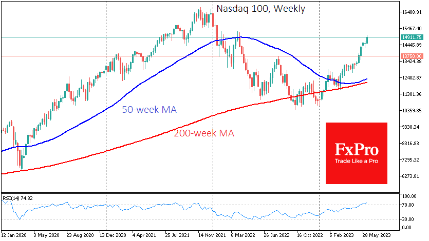 技术分析表明市场过热。在周线和日线上,相对强弱指数处于超买区域(70以上),这表明修正即将到来。恐惧与贪婪指数(Fear & Greed Index)达到82,与今年2月1日的高点相当,当时股市经历了1.5个月的盘整。