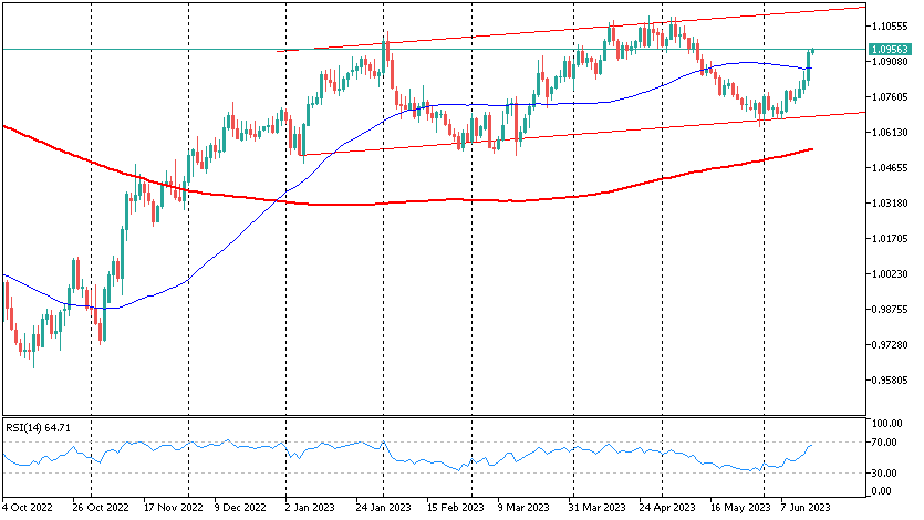 市场在一段时间后才意识到欧洲央行立场的严肃性。该评论发布后,欧元兑美元最初上涨了0.5%,但与5月份相比并没有明显疲软,在新闻发布会之后回升,并在当天余下的时间里持续上涨,欧元兑美元上涨了1.1%,在1.0950附近稳定下来。