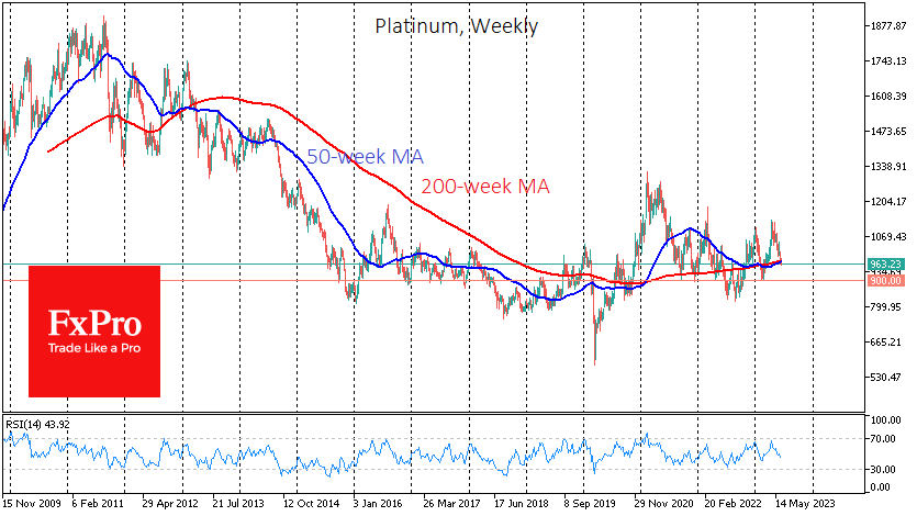 目前的抛售看起来像是专注于长期技术面的基金头寸清算。我们看到,在跌破200周和50周移动平均线(MA)之后,第三个交易日的抛售压力连续增加。然而,铂金尚未进入超卖区域,仍有可能跌至900美元,自2015年底以来,铂金多次获得支撑。