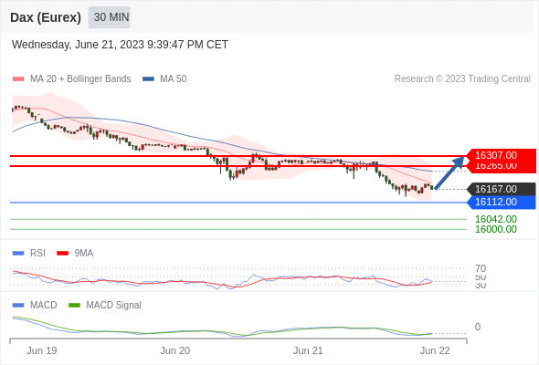 如跌破 16112 ,德国DAX指数期货 (Eurex) 目标方向定在 16042 和 16000 。
