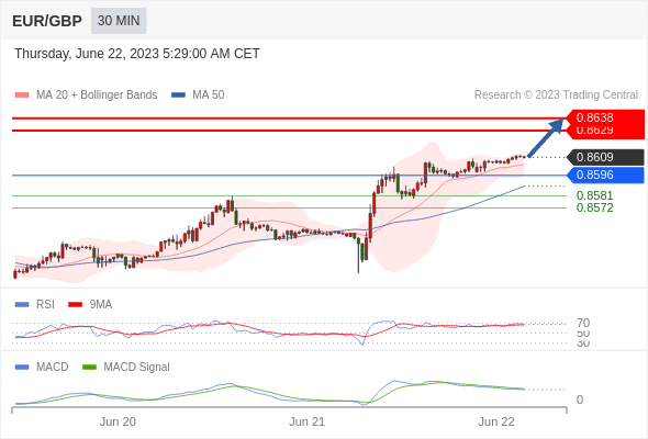 RSI技术指标大于中性区域50。 MACD技术指标处在其信号线之下 看多。 此外,价位处在其20天及50天移动平均线上方 ( 当前是 0.8604 和 0.8588 )。