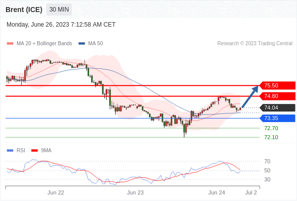 在 73.35 之上,看涨,目标价位为 74.80 ,然后为 75.50 。