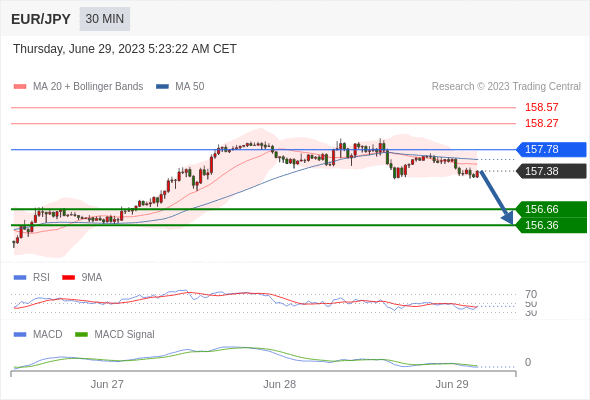 欧元/日元 当日内: 看跌,在 157.78 之下。