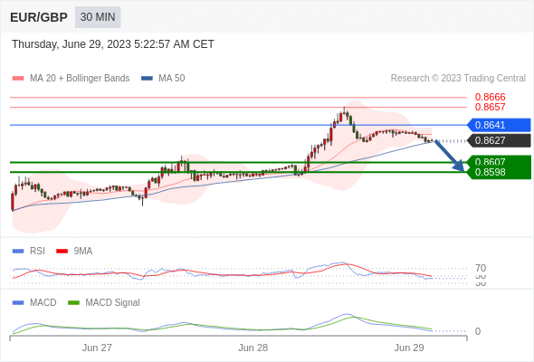 欧元/英镑 当日内: 逐渐下跌,当 0.8641 阻碍上行,则 0.8598 为目标位。